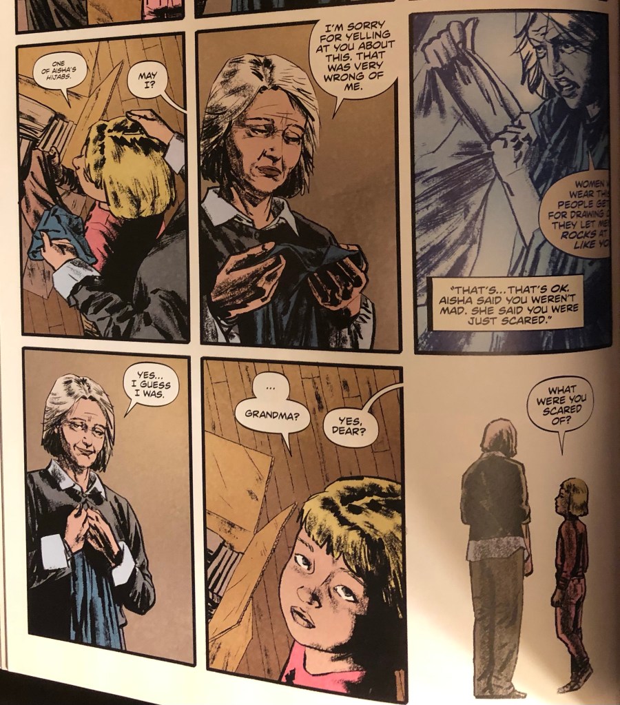 Leslie’s apology is followed by a flashback of Leslie ripping the hijab off of Kris’ head as she screams at her. Kris’ dialogue in the present lays over the scene. She tells her grandmother, “That’s ok. Aisha said you weren’t mad. She said you were just scared.” What was Leslie scared of? We never get much with Leslie’s past, but when Kris asks her what scared her, we see three panels where Leslie reflects on where that fear may have originated.
