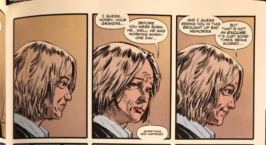 The first panel is wordless and shows Leslie in profile as she contemplates her response to Kris. In the next panel, she turns towards the reader, and Kris, as she says, “I guess honey, your grandpa. Before you were born. He . . . well, he was working when one day something bad happened.” Leslie doesn’t specify what happened, and we’re left wondering what exactly occurred. Considering that the narrative takes place in New York, we can assume Leslie’s husband died on 9/11. Leslie continues, turning back into a profile, looking away from Kris and the reader, telling her granddaughter, “And I guess seeing you in this brought up bad memories. But that’s not an excuse. It’s just sometime’s being scared . . .”