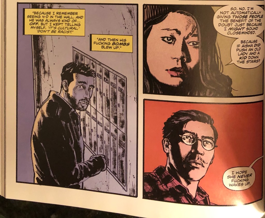 Grace, another of the building’s occupants, works to be politically correct, but she buys into the fear and rhetoric and calls Aisha a killer after, during an encounter with the monsters, she appears to push Kris and Leslie down the stairs, putting Kris in a coma and killing Leslie. As she drinks coffee with Ethan and Reynolds, she talks about not wanting to be racist when interacting with Ahmad and she believes that Aisha purposefully pushed Kris and Leslie down the stairs. She tells Ethan and Reynolds, “So, no, I’m not automatically giving those people the benefit of the doubt just because I might sound closeminded.”
